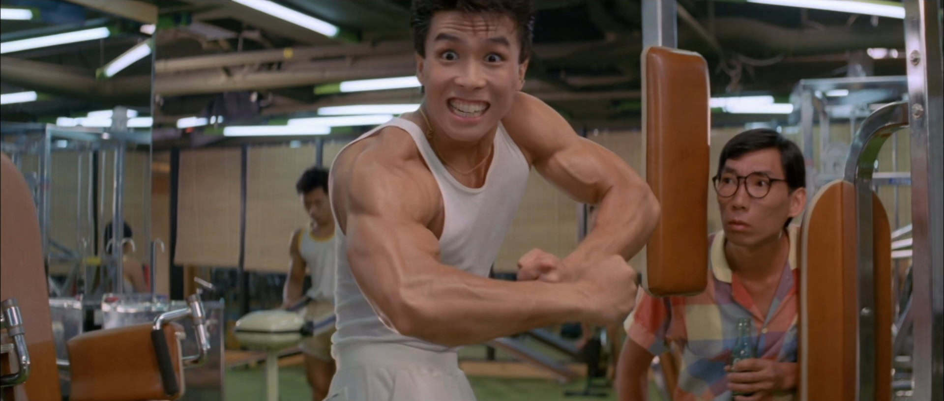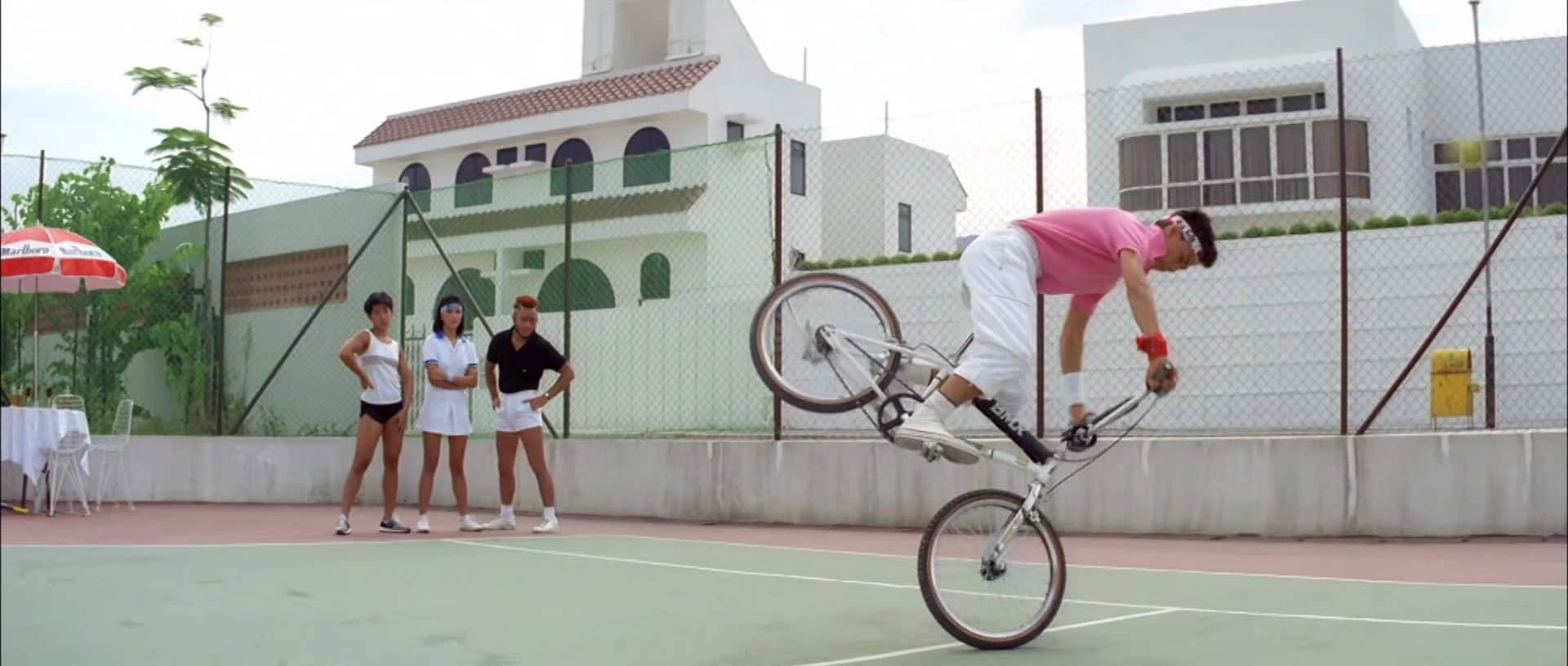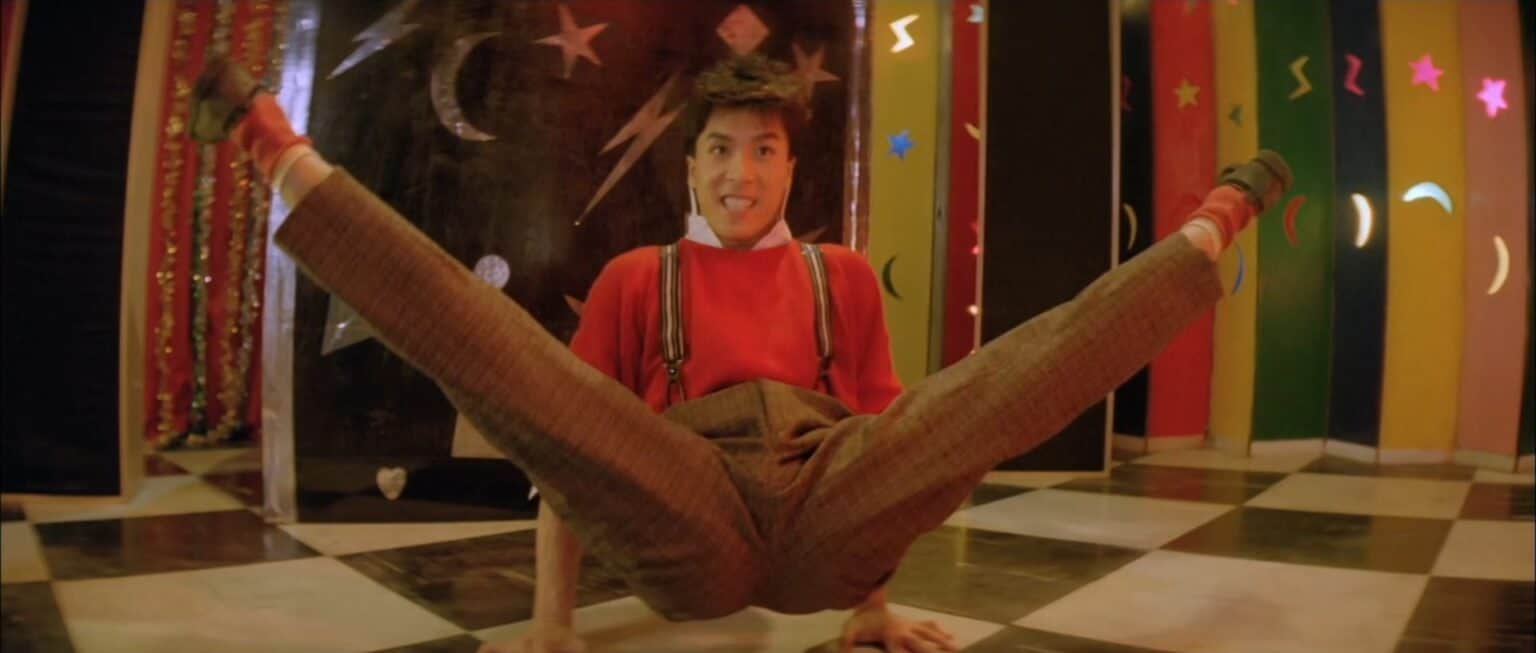 Domnělé vrcholy dobové dramaturgické nesoudnosti a estetické zhůvěřilosti jako Brejkovat 2: Electro bugalú (Breakin‘ 2: Electric Boogaloo, 1984) či Discopříběh (1987) nechává hongkongský vyzyvatel válet spráskané v prachu ulice zvířeném absurdně velkým boombox kazeťákem. Z každé zdejší scény sálá unikátní mix hysterické karikatury, zběsilé švihlosti a fantasmagorické kreativity, ať už zrovna předvádí rozjančenou fyzickou akrobacii, noří se do pitvořivě afektovaných hlubin lidového humoru, nebo se jen opájí dobovými artefakty. Na BMX kolech se tu tedy nejezdí, ale hraje tenis, autíčka na dálkáč slouží k deeskalaci partnerských krizí a breakdance se mísí s kung-fu do exhibicí tělesných dovedností, které vyvolávají fascinovaný úžas i navzdory módnímu peklu, které mají postavy na sobě.